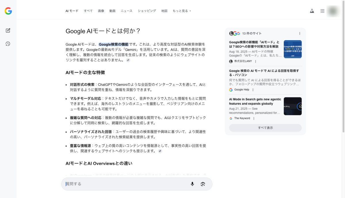Google 検索の AI モードとは、検索した内容に合わせて Google の生成 AI「Gemini」がユーザーの意図に合わせた回答を作成し、表示する機能です。2025年8月現在、日本では英語版のみリリースされています。