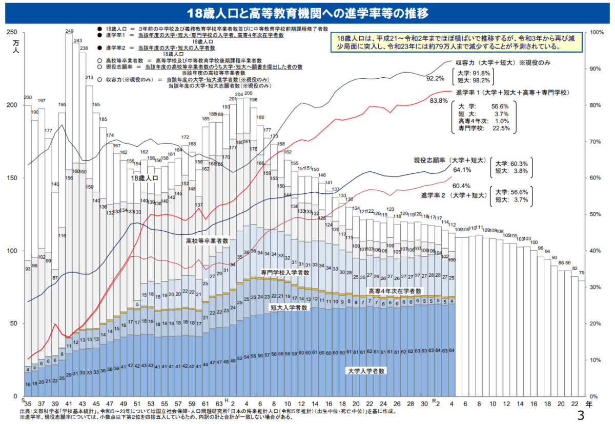 まず、最大の課題として考えられるのは、「ターゲットとなる母数の減少」です。文部科学省が公表しているデータによれば、18歳人口は2024年以降減少し続けており、2040年には現在の約7割程度にまで落ち込むと予測されています。