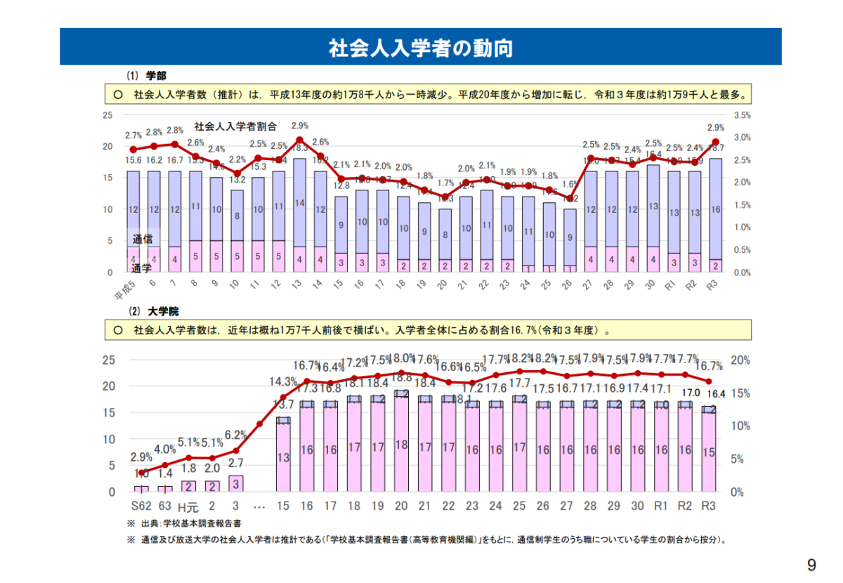 実際に文部科学省「大学等進学者数に関するデータ 関係」のグラフからも平成27年までは減少傾向でしたが、それ以降は増加傾向で、特に令和3年度は社会人入学者が約1万9,000人と過去最多となっています。