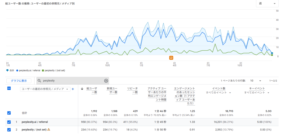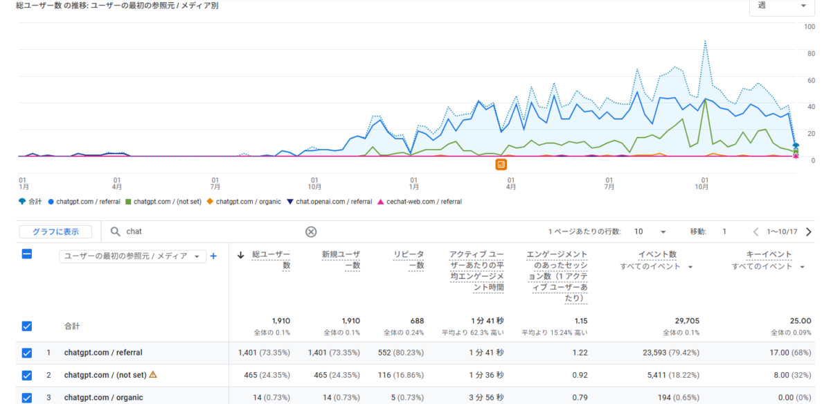 とは言え、ネット全体での AI 検索の利用度を調べるための資料などは現時点では見つからなかったため、今回は Google アナリティクス4(以下:GA4)を用いて各 AI 検索からキーワードマーケティングのサイトへの流入数の推移を調査することにしました。