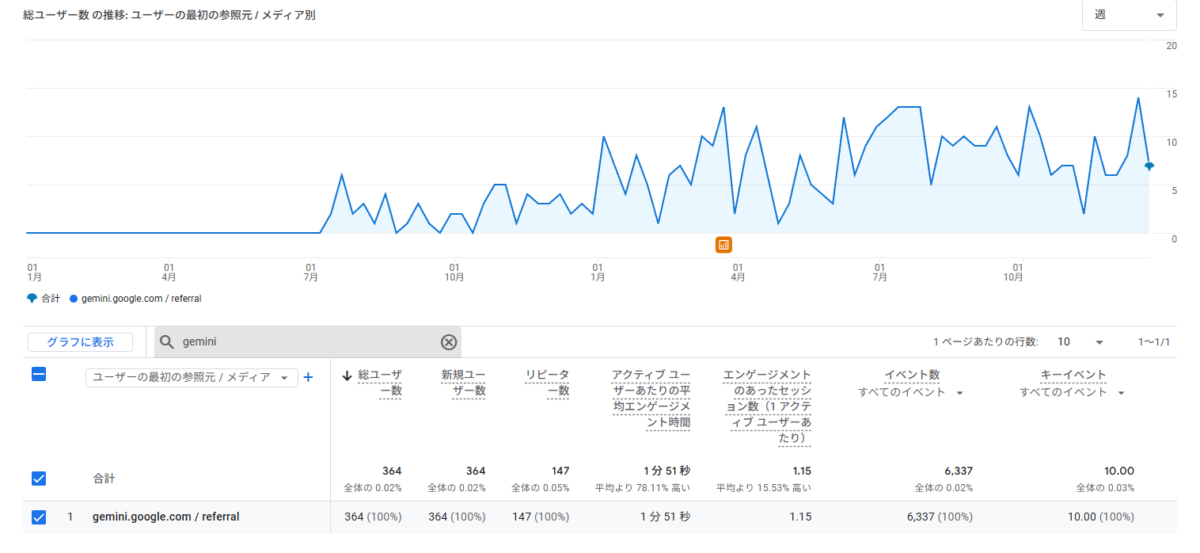Google が開発したAI 検索・Gemini(ジェミニ)は、数はかなり少ないものの、夏以降に AI 検索が話題になってからは一定数のサイト流入が発生しています。2025年8月に登場し、話題になった画像生成機能「NanoBanana」が、サイト流入にも貢献したようです。