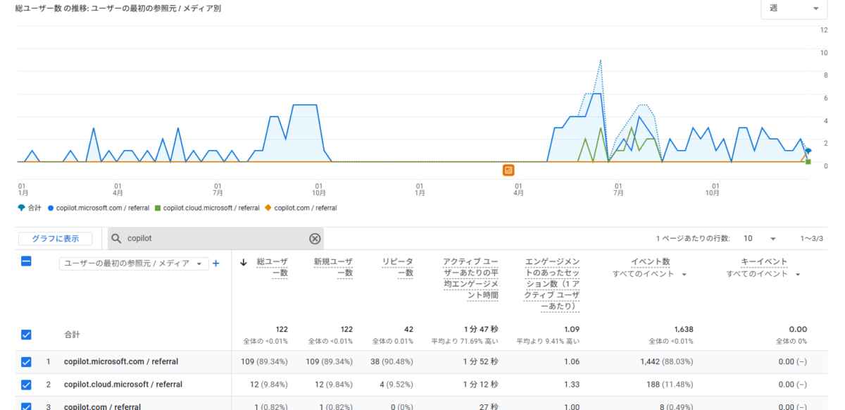 Microsoft 社が2023年にリリースした AI 検索機能・Copilot(コパイロット)も、先ほどの Gemini と同様に数は少ないものの、流入自体は一定数ありました。