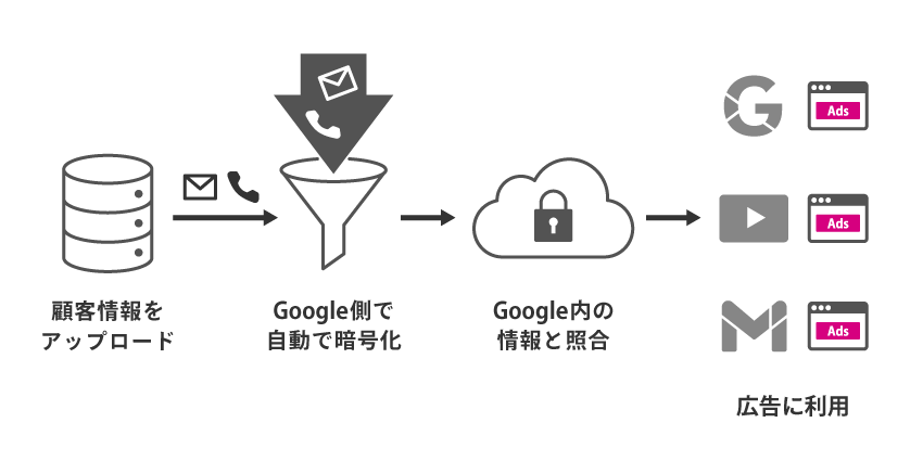カスタマーマッチに使われる顧客データは、システムに取り込まれる際、Google 側で不可逆的な暗号化(ハッシュ化)をおこないます。そのため、Google 側でも「元の個人情報」を参照できません。