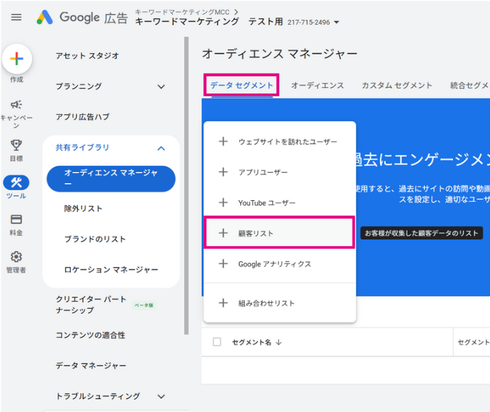 次に、オーディエンスマネージャー内にある「データセグメント」タブから+マーク「顧客リスト」をクリックします。