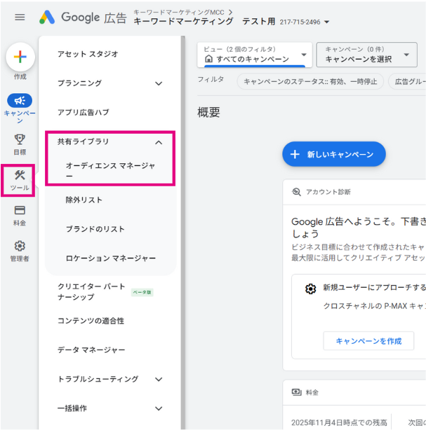 まず、Google 広告の管理画面左側の「ツール」(スパナアイコン)をクリックし、その中にある共有ライブラリの「オーディエンスマネージャー」を選択します。