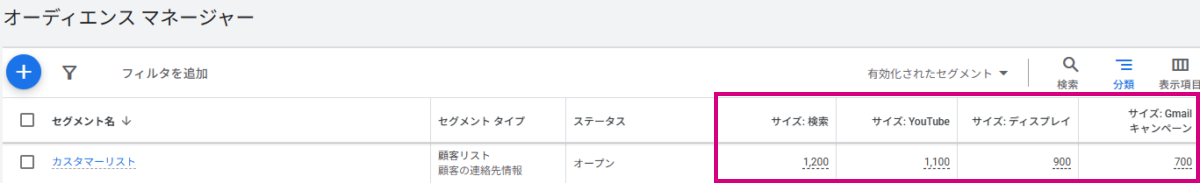 このリストサイズ(マッチ数)は Google 検索や YouTube などのネットワークで、アップロードしたデータのうち何件が Google アカウントと照合(マッチ)したかを表しています。