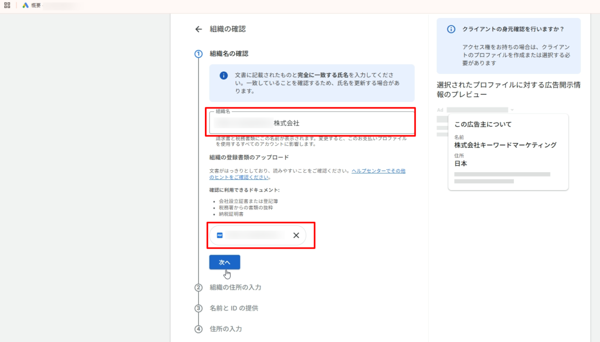 続いて、ステップ1でクライアントから入手した履歴事項全部証明書等の書類をアップロードし、広告主の身元確認作業を進めます。場合によっては「ビジネス オペレーションの確認」として、広告主と代理店の関係性(代理店契約など)の証明が求められることもあります。