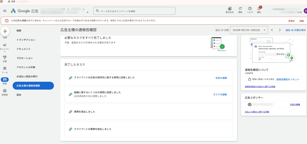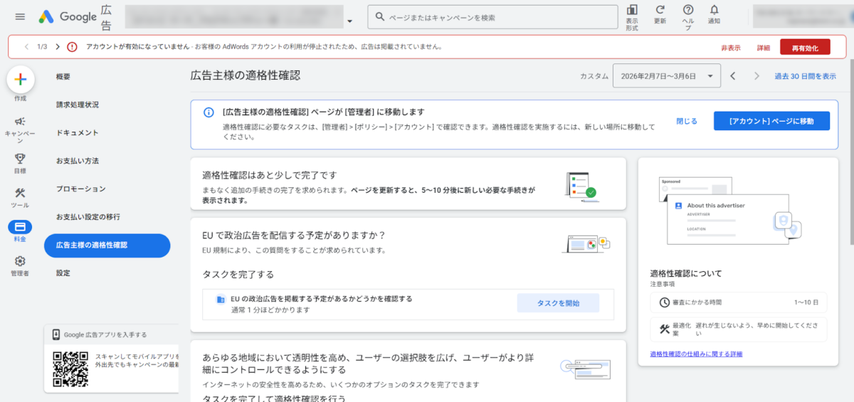 対応する場合は Google 広告管理画面の「料金>広告主」の適格性確認から対応しましょう。