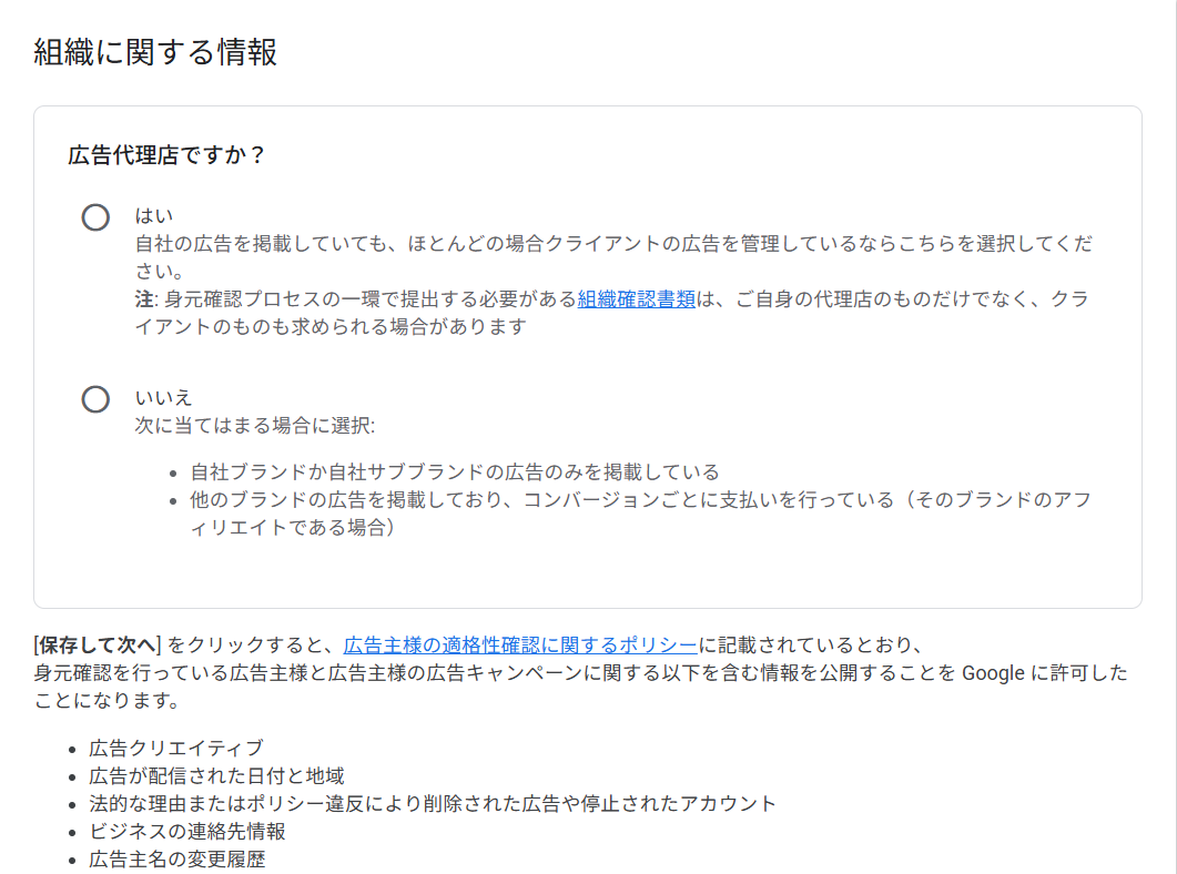 Google 広告の管理画面から「ビジネスに関する質問」に進み、「広告代理店ですか?」という設問に対して「はい」を選択します。審査の過程で、代理店自身の組織確認書類の提出が求められる場合があるため、画面の指示に従って情報を登録しましょう。