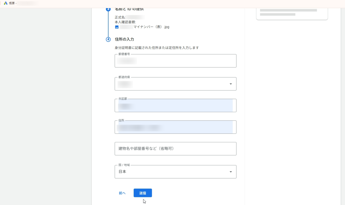 さらに、「住所を入力」の箇所では、先ほどアップロードした書類と同じ住所を入力し、「送信」を押すと、身元確認の作業はすべて完了です。