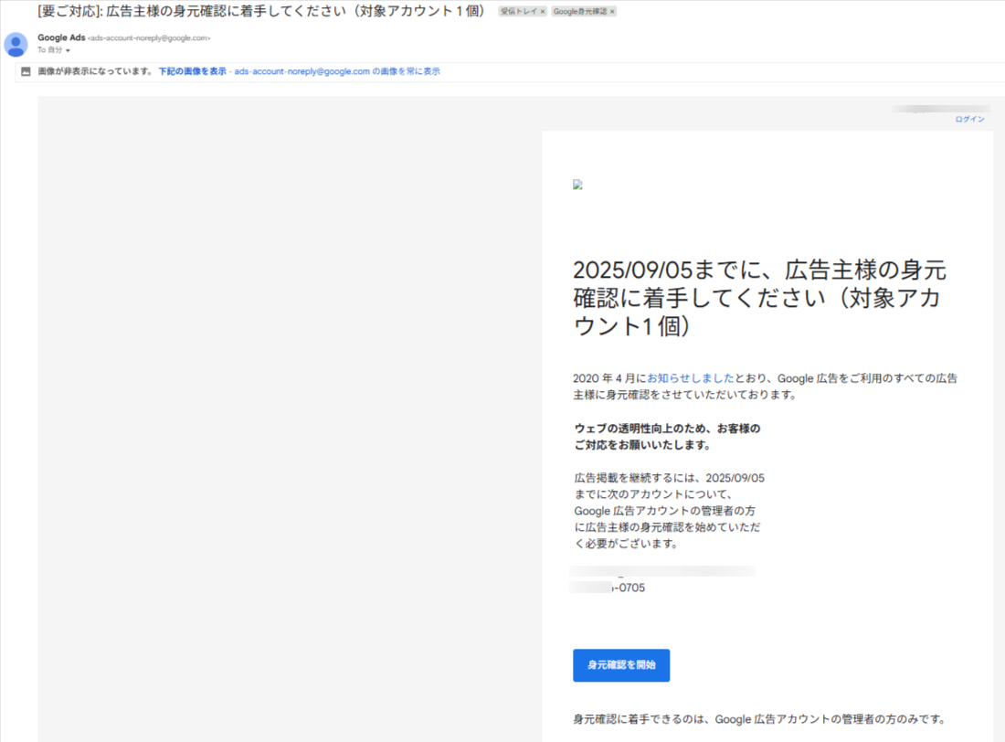 適格性確認が必要かどうかは、Google 広告管理画面の上部に表示される「適格性確認を開始してください」という赤いバー、または登録メールアドレスに届く通知から確認できます。