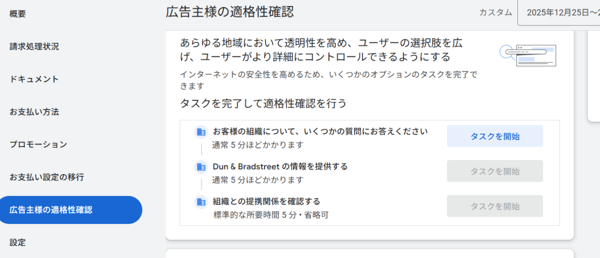 アクセス後、「広告主様の適格性確認」から「タスクを開始」をクリックし開始します。