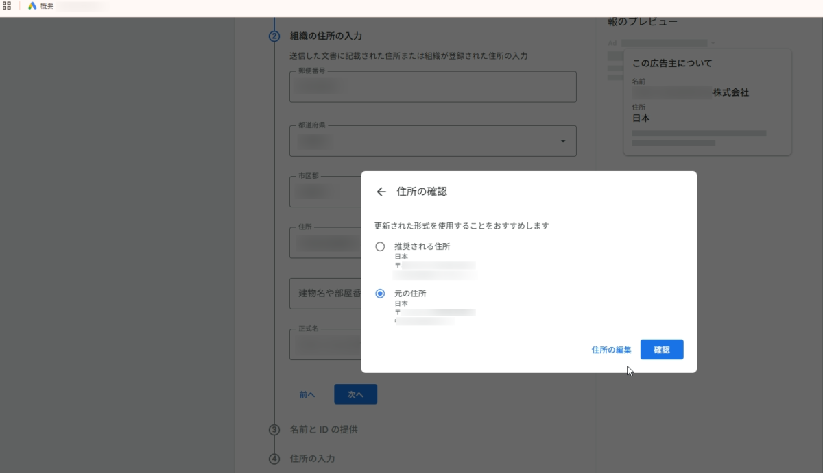 次に「組織の住所の入力」で住所や郵便番号を入力しましょう。入力後に「住所の確認」で推奨する住所か元の住所かを選択する画面が表示されるため、「元の住所」を選択しましょう。