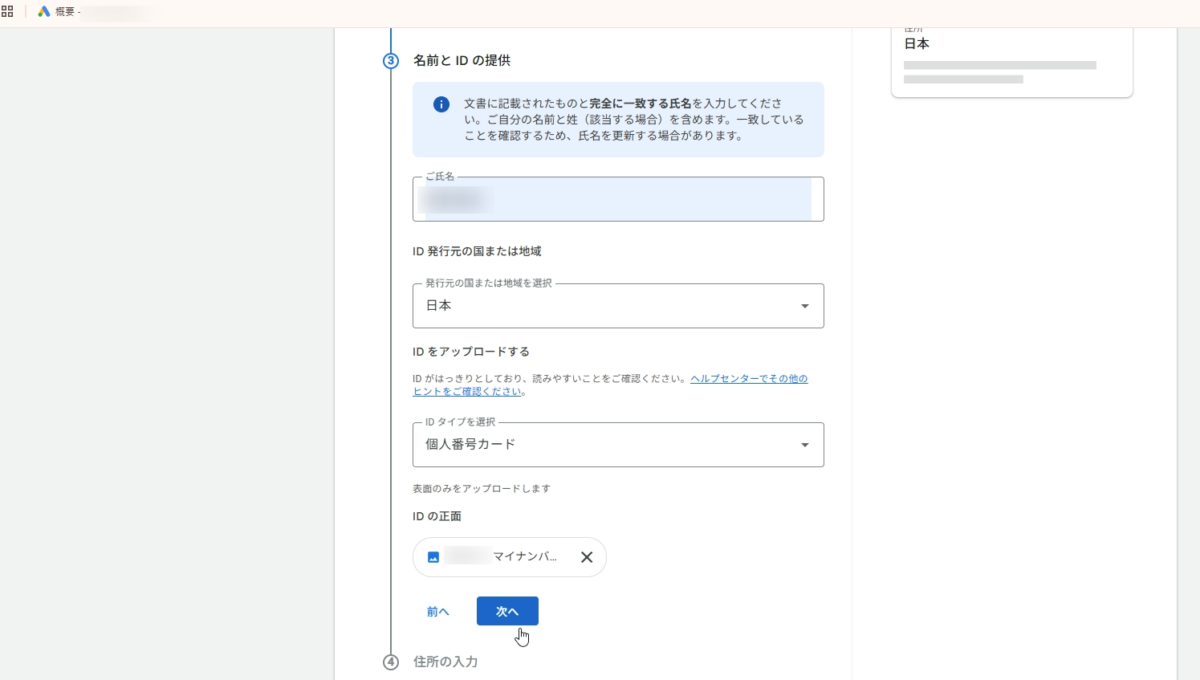 そして、「名前とIDの提供」で運転免許証や、マイナンバーに記載のある氏名と、「IDタイプを選択」を選択で、アップロードする書類の種類を選択し、そのまま書類をアップロードしましょう。