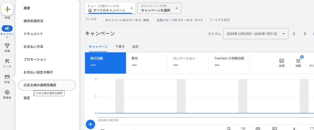 上記以外にも、広告管理画面左バーの「料金」内にある「広告主様の適格性確認」からアクセスできます。