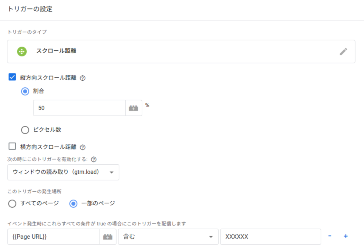 ランディングページなどの特定のページのスクロール距離を計測するため、このトリガーを設定する際は「トリガーの発生場所」で「一部のページ」を選択しましょう。