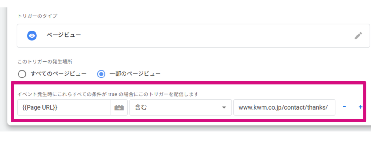 その後、「一部のページビュー」を選んだ場合は詳細条件として「変数」「演算子」「値」を追加で設定しましょう。今回の場合だと以下のようになります。