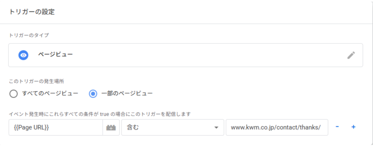 「ページビュー」は、特定のページにユーザーが到達したタイミングでタグを発火させるトリガーです。サンクスページに到達した件数やフォームまで到達した件数などを計測したい場合に使います。