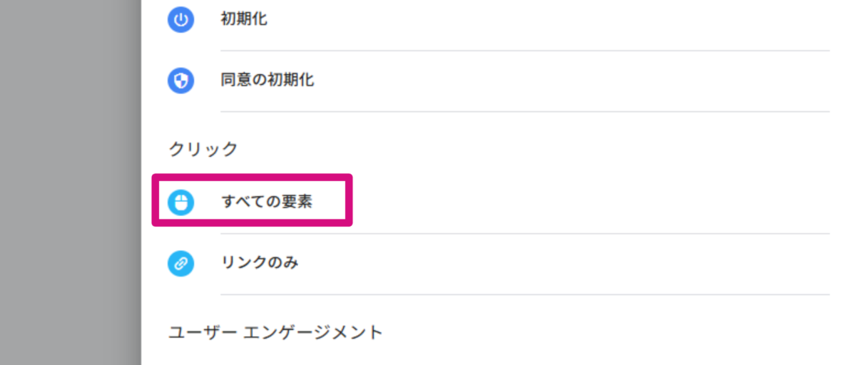 ただし、文字通りページ内の「すべての要素」で発火してしまうため、後述する変数や値の設定をして誤計測を防ぎましょう。