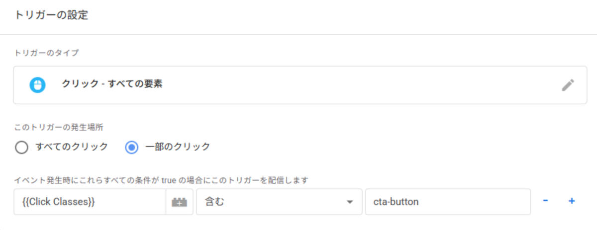 一方「一部の」とつくものは、特定の条件に合致したときだけタグが発火するものです。ページ上の特定の CTA ボタンをクリックしたときのみ発火させる場合に使われます。