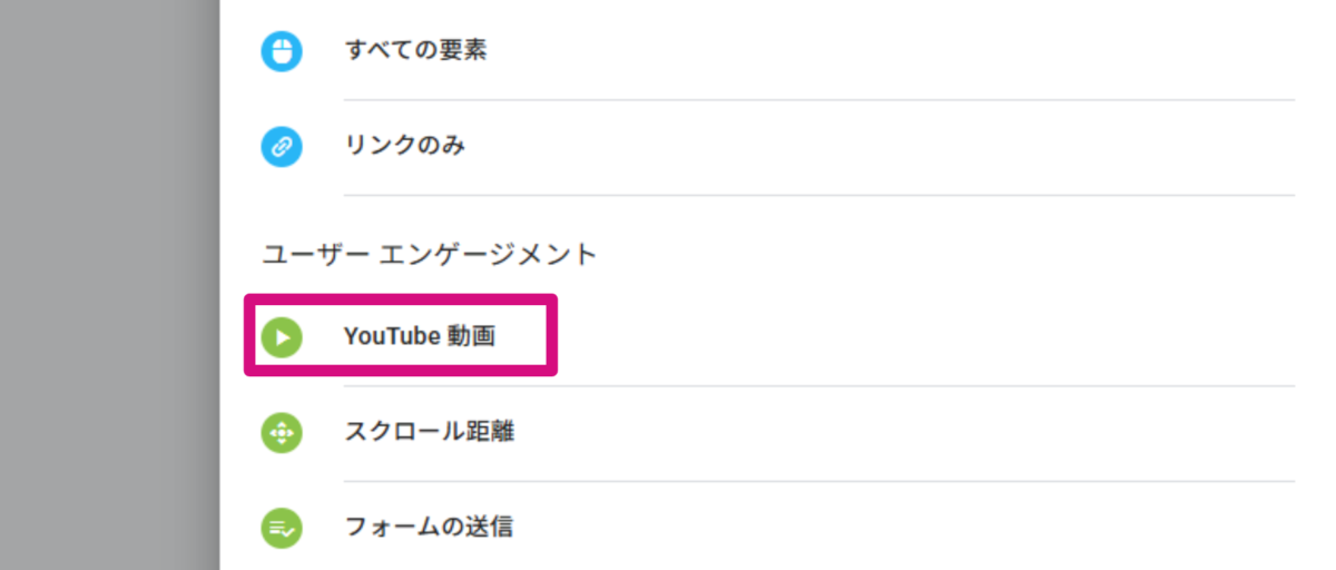 「YouTube 動画」は、ページ内に埋め込まれた YouTube 動画に対して、ユーザーがとったアクションを検知し、それに応じて発火するトリガーです。ユーザーの操作とは、再生、一時停止、視聴完了などを指します。