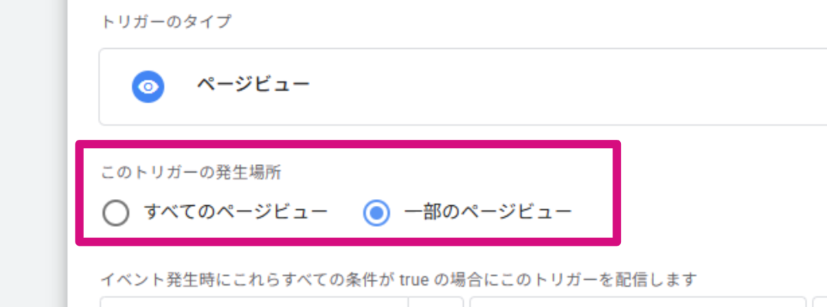 以下のような画面に切り替わったら、「このトリガーの発生場所」という項目で「すべてのページビュー」と「一部のページビュー」のいずれかを選びます。