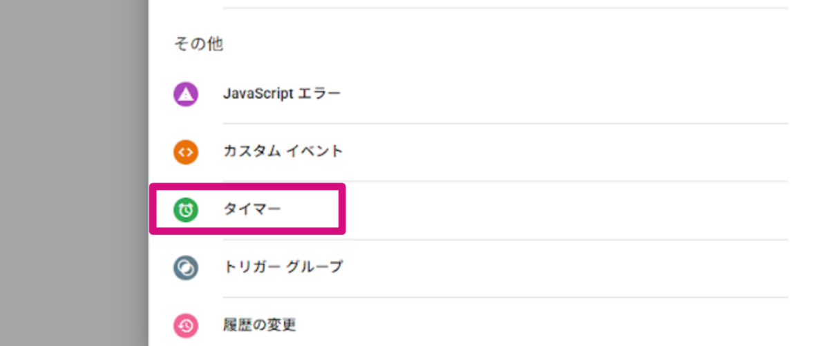 「タイマー」は、ユーザーがページを開いた後、経過した時間にあわせてタグが発火するトリガーです。どのくらい時間が経ってから発動するかは任意で決められます。