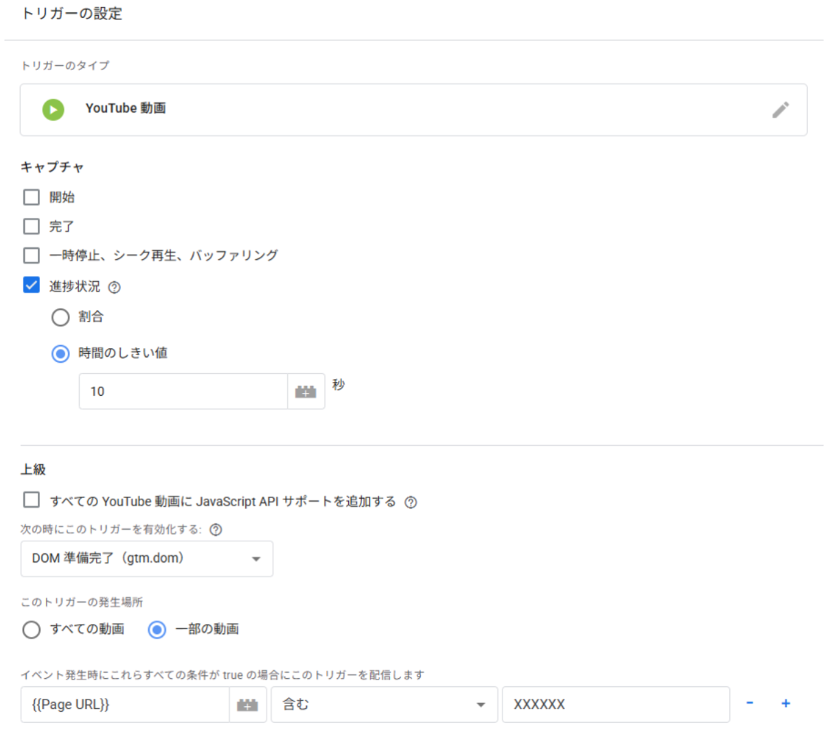 例えば、YouTube 動画を10秒視聴したユーザーを測定する場合は、キャプチャの項目を「進捗状況」の項目を選びます。具体的には、以下のように設定します。