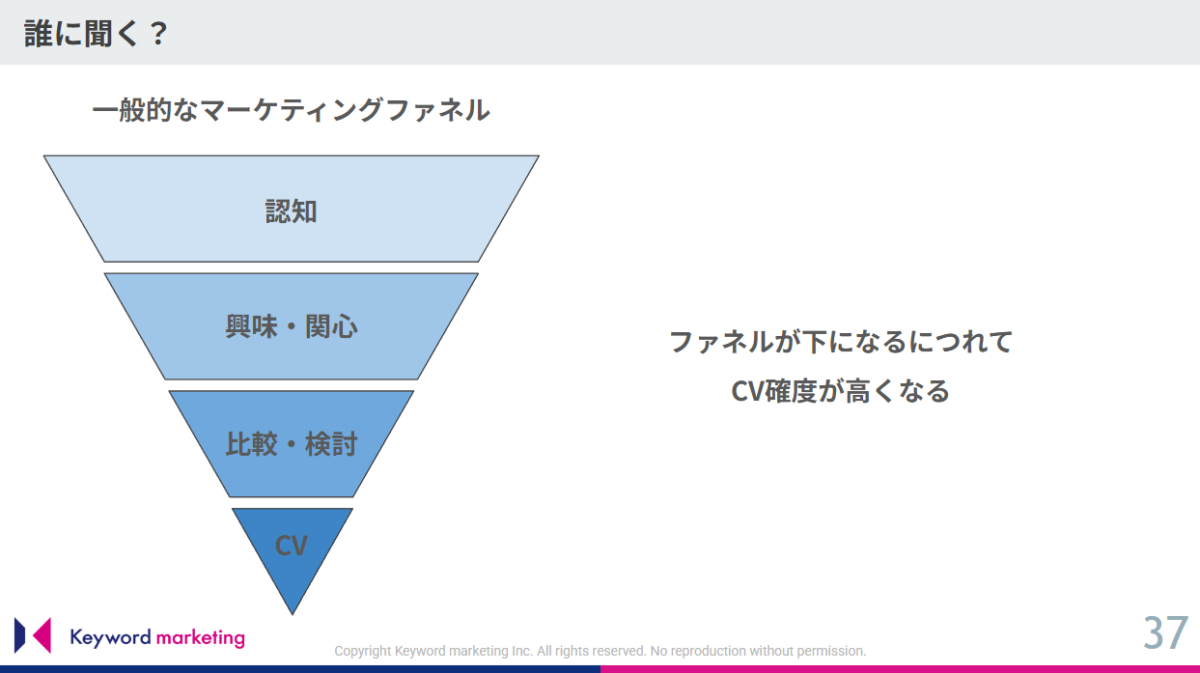 まずはヒアリング対象を定めましょう。キーワードマーケティングではユーザーをマーケティングファネルと呼ばれる段階に分けています。