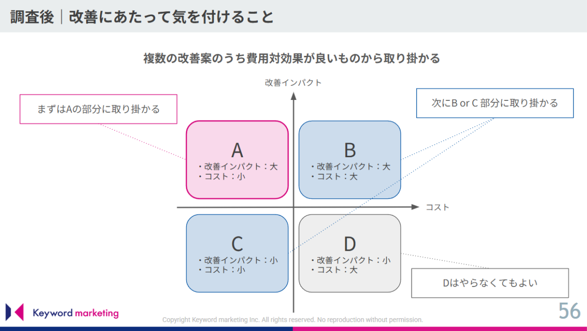LP 改善に取り組む際は、費用対効果の良いところから着手しましょう。以下のスライドは改善インパクトとコストの関係を示したものです。このスライドを見つつ、改善したい箇所が A から D のどれに当てはまるか確認しましょう。