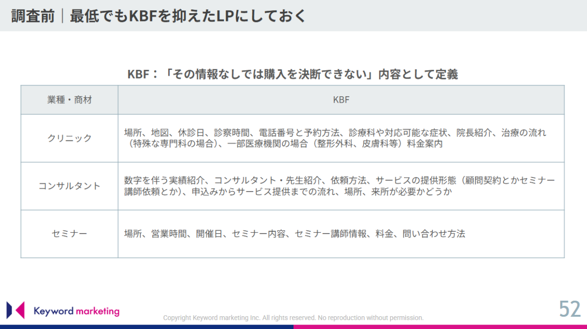KBF とは、「その情報なしでは購入を判断できない要素」を指します。KBF を洗い出すことで、LP に必ず掲載すべき情報が明確になります。もし現状で KBF が不足していると感じる場合は、まずそれらの情報を LP に追加してみましょう。