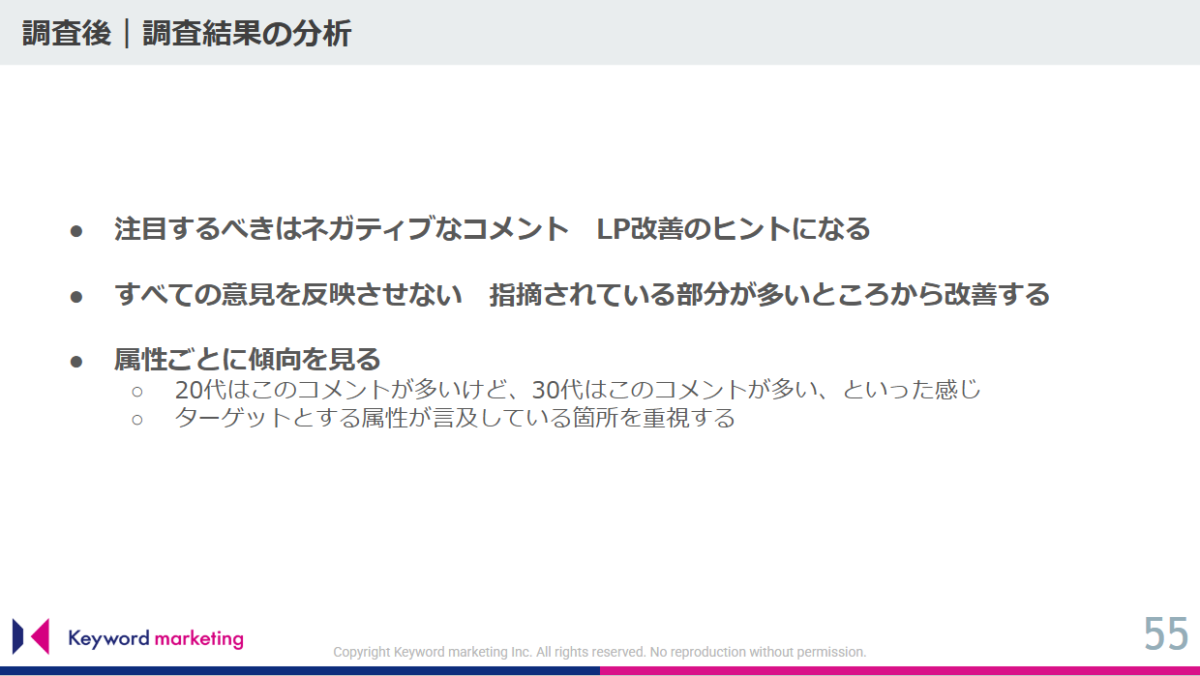 たとえばネガティブなコメントはユーザーの不安や課題点を見つけることができ、属性別に傾向を見ることでターゲットとする年代の再確認とターゲットに対してフォーカスしながら改善を進めることができます。