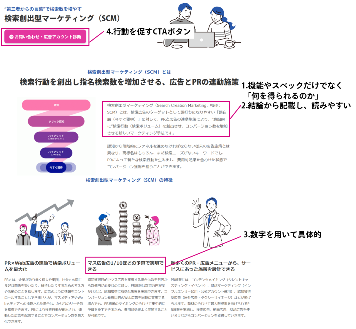 以上の4点を意識することで、LP を見たユーザーからアクションが起こりやすくなります。キーワードマーケティングのホームページをもとに OK 例も紹介しているので、ライティングを考える際のヒントにしてください。