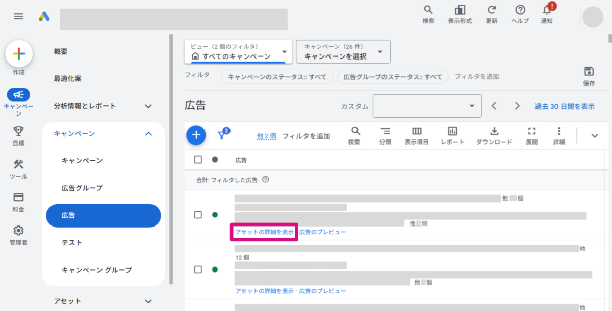 2025年9月現在、Google広告の管理画面の「広告」タブで「アセットの詳細を表示」を選択することで 各アセットのコンバージョン数を確認できるようになりました。