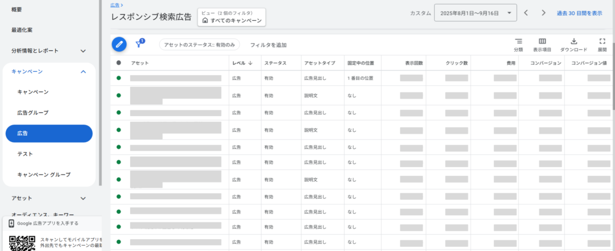 参考:レスポンシブ検索広告の広告単位のアセット レポートについて – Google 広告 ヘルプ