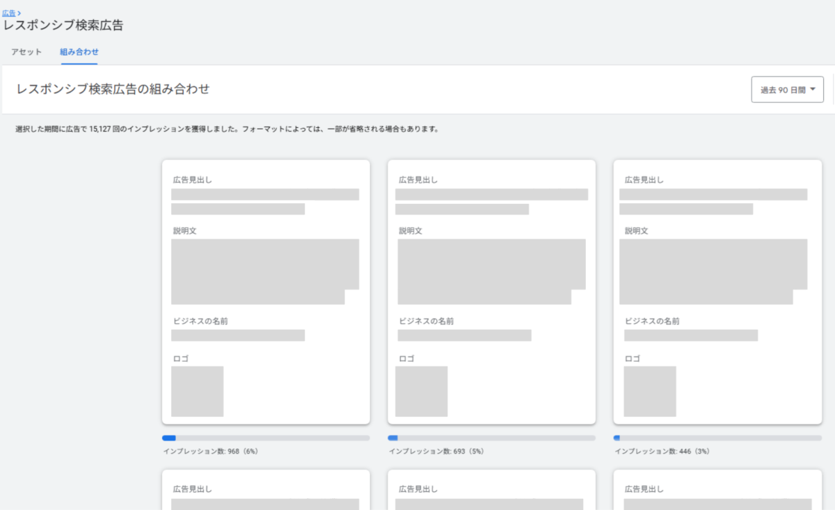 Google 広告の管理画面では、多く表示された見出しや説明文、実際に配信された組み合わせのパターンを確認できます。