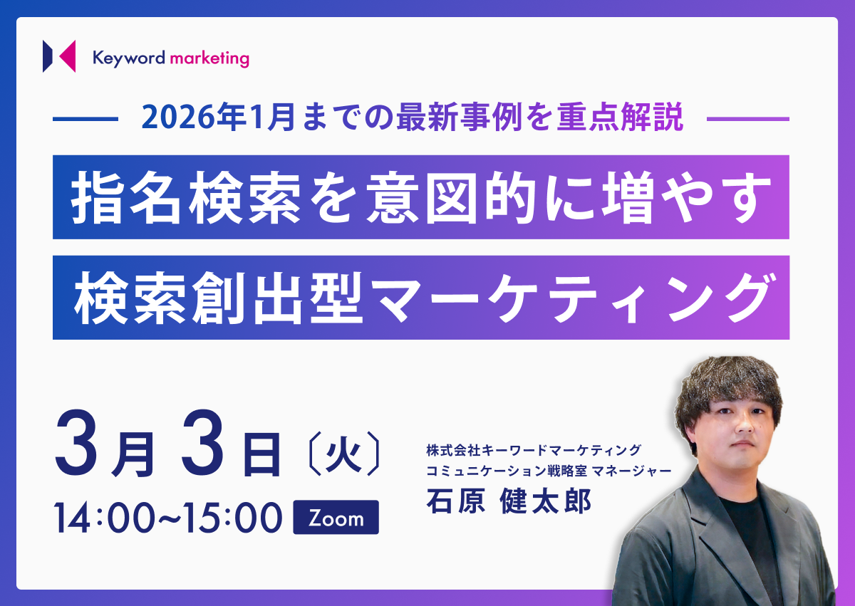 以前、同テーマのセミナーに参加された方にとっても、ご自身のナレッジをアップデートできる内容となっています。 指名検索を意図的に増やし、確実に売上へつなげるための具体的な実装イメージを、ぜひお持ち帰りください。